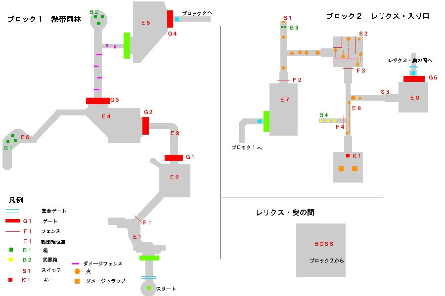 フェンスと炎のトラップエリアは、一人がトラップを破壊し、もう一人がスイッチを押すと言う風に役割分担した方がいい